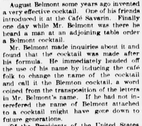 – „August Belmont some years ago invented a very effective cocktail. One of his friends introduced it at the Café Savarin. Finally one day while Mr. Belmont was there he heard a man at an adjoining table order a Belmont cocktail. Mr Belmont made inquiries about it and found that time cocktail was made after his formula. He immediately headed off the use of his name by inducing thin café folk to change the name of the cocktail and sall it the Blemton cocktail, a word coined from the transposition of the letters in Mr. Belmont’s name. If he had not interefered the name of Belmont attached to a cocktail might have gone down to future generations.“ [15]