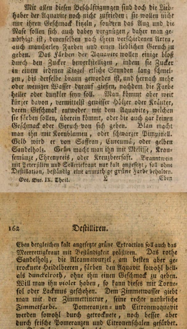Johann Georg Krünitz schreibt im selben Band weiterhin über das Färben: „Mit allen diesen Beschäftigungen sind doch die Liebhaber der Aquavite noch nicht zufrieden; sie wollen nicht nur ihren Geschmack kitzeln, sondern das Auge und die Nase sollen sich auch dabey vergnügen, daher man genöthigt ist, denenselben nach ihren verschiedenen Arten, auch mancherley Farben und einen lieblichen Geruch zu geben. Das Färben der Aquavite wollen Einige bloß durch den Zucker bewerkstelligen, indem sie Zucker in einem irdenen Tiegel, etliche Stunden lang, schmelzen, bis derselbe braun geworden, und hernach mehr oder weniger Wasser darauf gießen, nachdem die Farbe heller oder dunkler seyn soll. Man kommt aber weit kürzer davon, vermittelst gewisser Hölzer oder Kräuter, deren Geschmack entweder mit dem Aquavit, welchen sie färben sollen, übereinkommt, oder die auch gar keinen Geschmack oder Geruch von sich geben. Blau macht man ihn mit Kornblumen, oder schwarzer Pimpinell. Gelb wird er von Safran, Curcumä, oder gelben Sandelholz. Grün macht man ihn mit Melisse, Krausemünze, Ehrenpreis, oder Kreuzbeersaft. Brandwein mit Petersilien und Selleriekraut nur kalt angesetzt, soll, ohne Destillation, beständig eine anmuthige grüne Farbe behalten. Eben dergleichen kalt angesetzte grüne Extraction soll auch das Meerrettigkraut mit Beständigkeit prästiren. Das rothe Sandelholz, die Alcannawurzel, am besten aber getrocknete Heidelbeeren, färben den Aquavit sowohl hell= als dunkelroth, ohne ihm einen Geschmack zu geben. Will man ihn violet haben, so kann dieses mit Tornesol oder Lackmus geschehen. Dem Zimmetwasser giebt man mit der Zimmet=Tinctur, seine rechte natürliche Zimmetfarbe. Pommeranzen= und Citronen=Aquavit, werden sowohl durch getrocknete, noch besser aber durch frische Pommeranzen und Citronenschalen gefärbet.“ [6-161] [6-162] [25-161] [25-162]